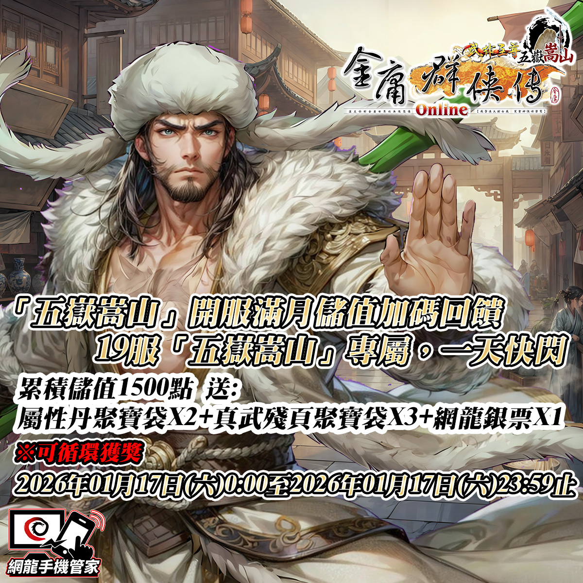 活動期間內,累積儲值達1500點,將可立即獲得【屬性丹聚寶袋*2+真武殘頁聚寶袋*3+網龍銀票*1】(贈送品/禮包價值為2120點),可循環獲獎。